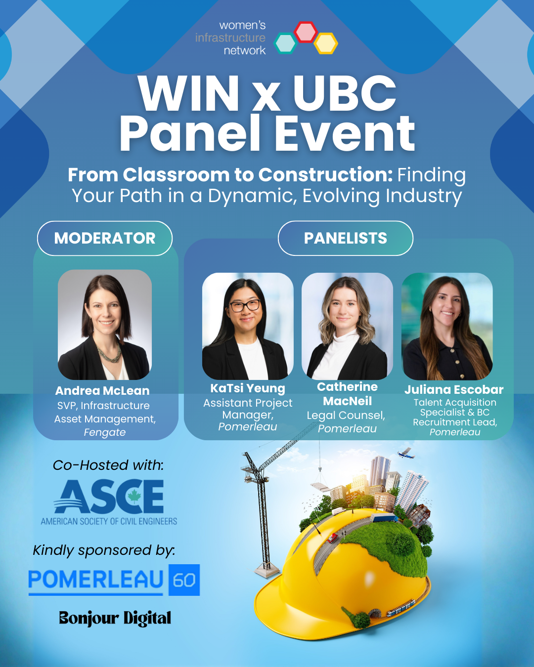 Come and meet the up-and-coming talent for our infrastructure industry! BC WIN, in partnership with Pomerleau and students and faculty from UBC’s faculties of engineering, business and law, is hosting an evening of networking and a lively panel on how those three disciplines work together to make large infrastructure projects happen. Come share your experiences with other members of BC WIN and with the students (who knows, you may meet your next hire!)